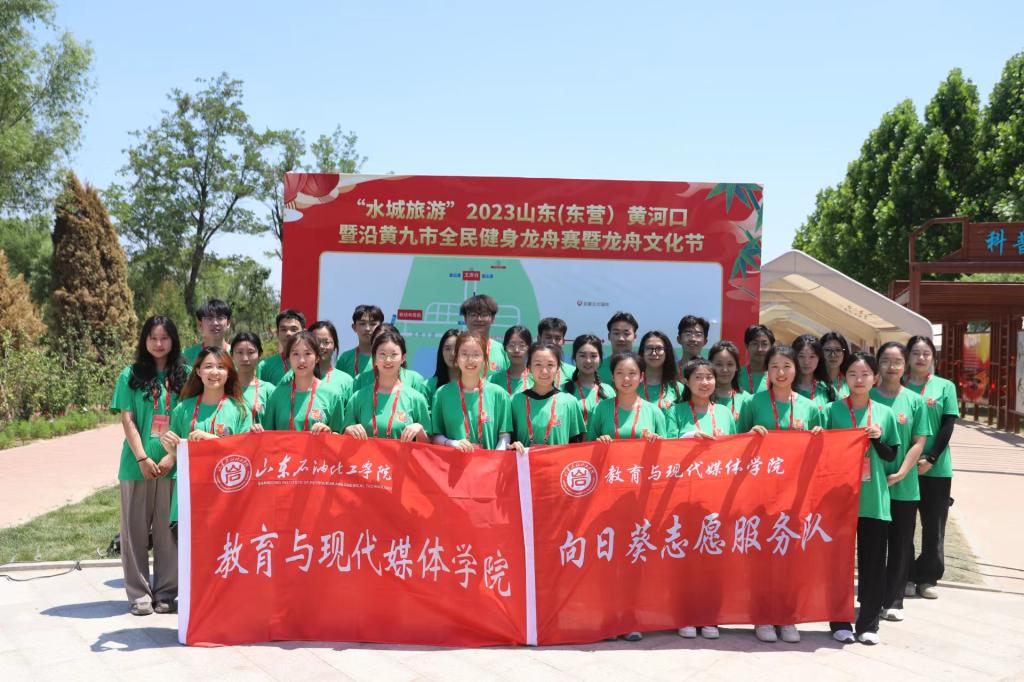 2023山东(东营)黄河口暨沿黄九市全民健身龙舟赛于6月21日–22日在东营区龙居镇龙栖湿地隆重举行,来自全省各地50余支龙舟队伍近千名运动员竞相参与。根据职责分工,教育与现代媒体学院组织招募了30名大学生志愿者,主要负责开幕式现场服务、赛事检录引导、秩序维护、器材管理、赛事宣告等工作。