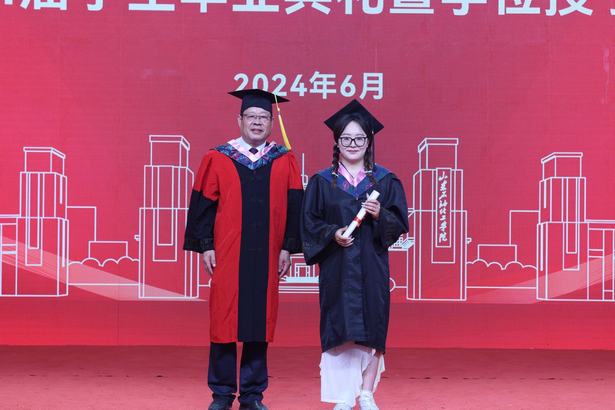 在典礼结束后,我院2024届毕业生学位授予仪式正式开始。学院党总支副书记、副院长赵森为毕业生拨穗、颁发学位证书,并合影留念。