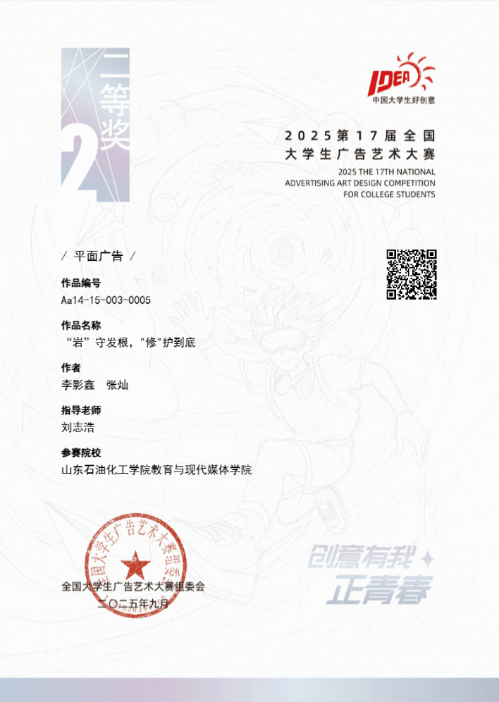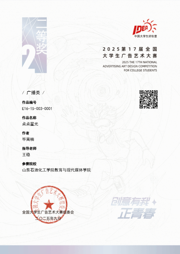 第十七届全国大学生广告艺术大赛全国总评审结果公布,我院学子获得全国二等奖3项、三等奖1项、优秀奖4项;山东省赛区一等奖1项、二等奖1项、三等奖2项、优秀奖15项。获奖作品类型涵盖广播、平面广告、动画等多个类别。