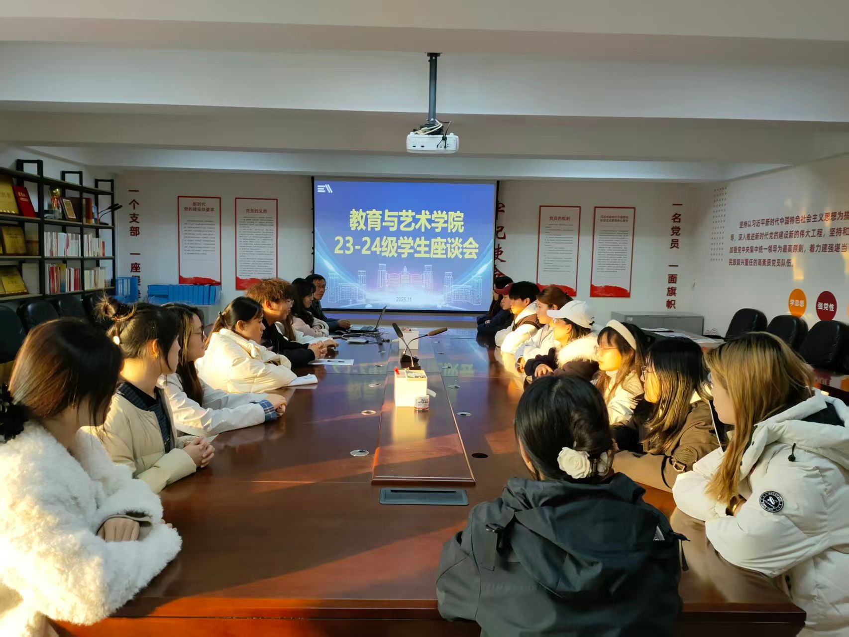 为畅通师生沟通渠道,深入了解学生思想动态与实际需求,切实解决学生在学习生活中遇到的困难与困惑,教育与艺术学院于近日分层、分类组织开展了“院长面对面”师生座谈会。学院院长赵森、副院长刘青山、院长助理范秀娟分别与大一新生、23-24级学生以及大四毕业生代表进行了深入交流,现场气氛融洽,互动积极。