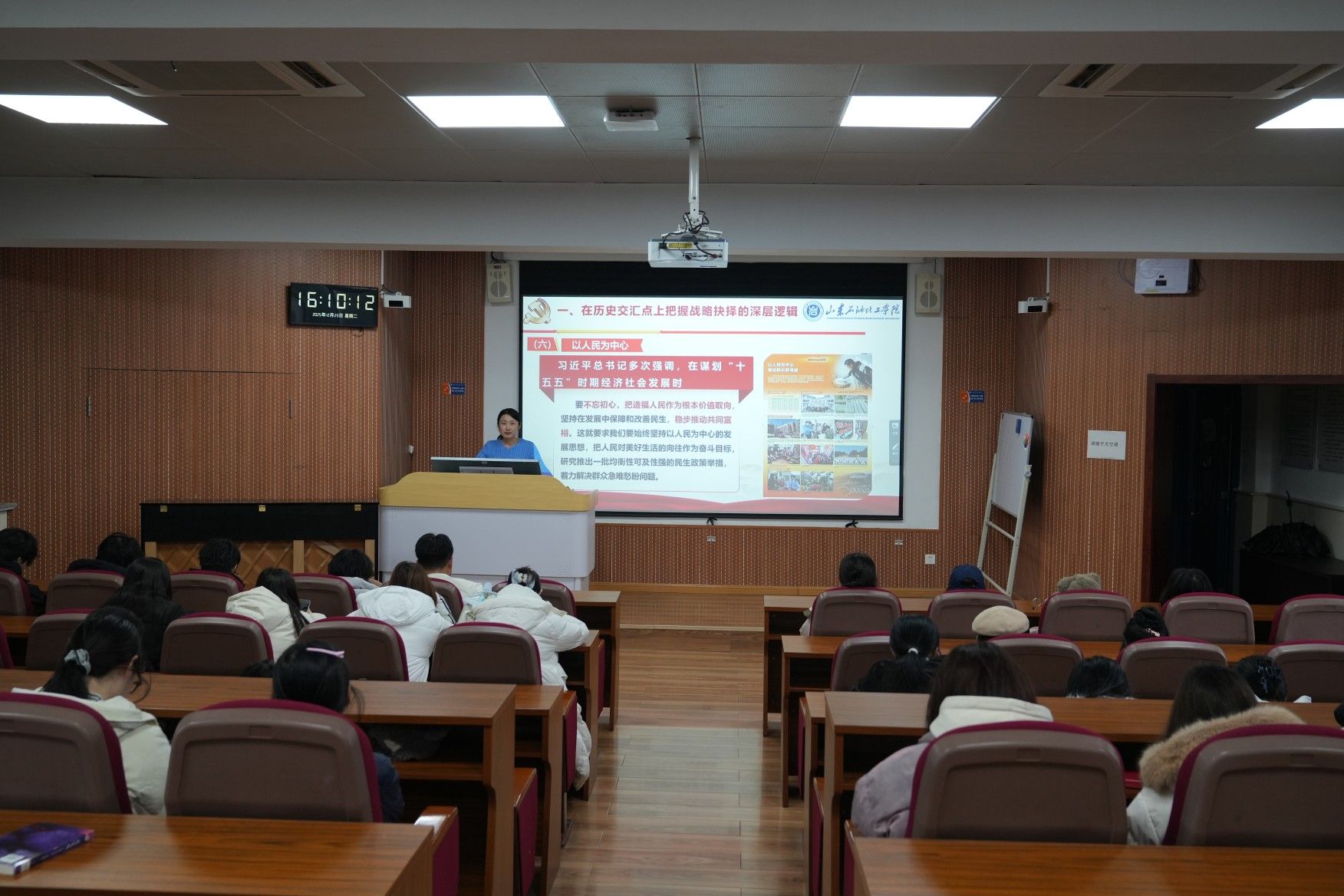 董小沙老师以“深学笃行党的二十届四中全会精神,接续推进中国式现代化”为主题,围绕三大核心内容展开:一是回顾“十四五”时期我国在经济、科技、民生等领域取得的历史性成就,凝聚发展底气;二是立足历史交汇点解读“十五五”规划的重大意义、核心原则,帮助师生明晰战略逻辑;三是展望全会擘画的未来蓝图,寄语师生立足时代坐标,锤炼过硬本领,勇担青春使命与育人重任。