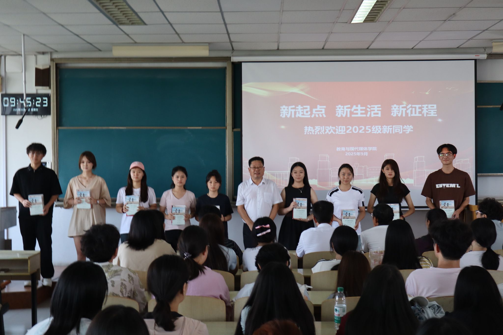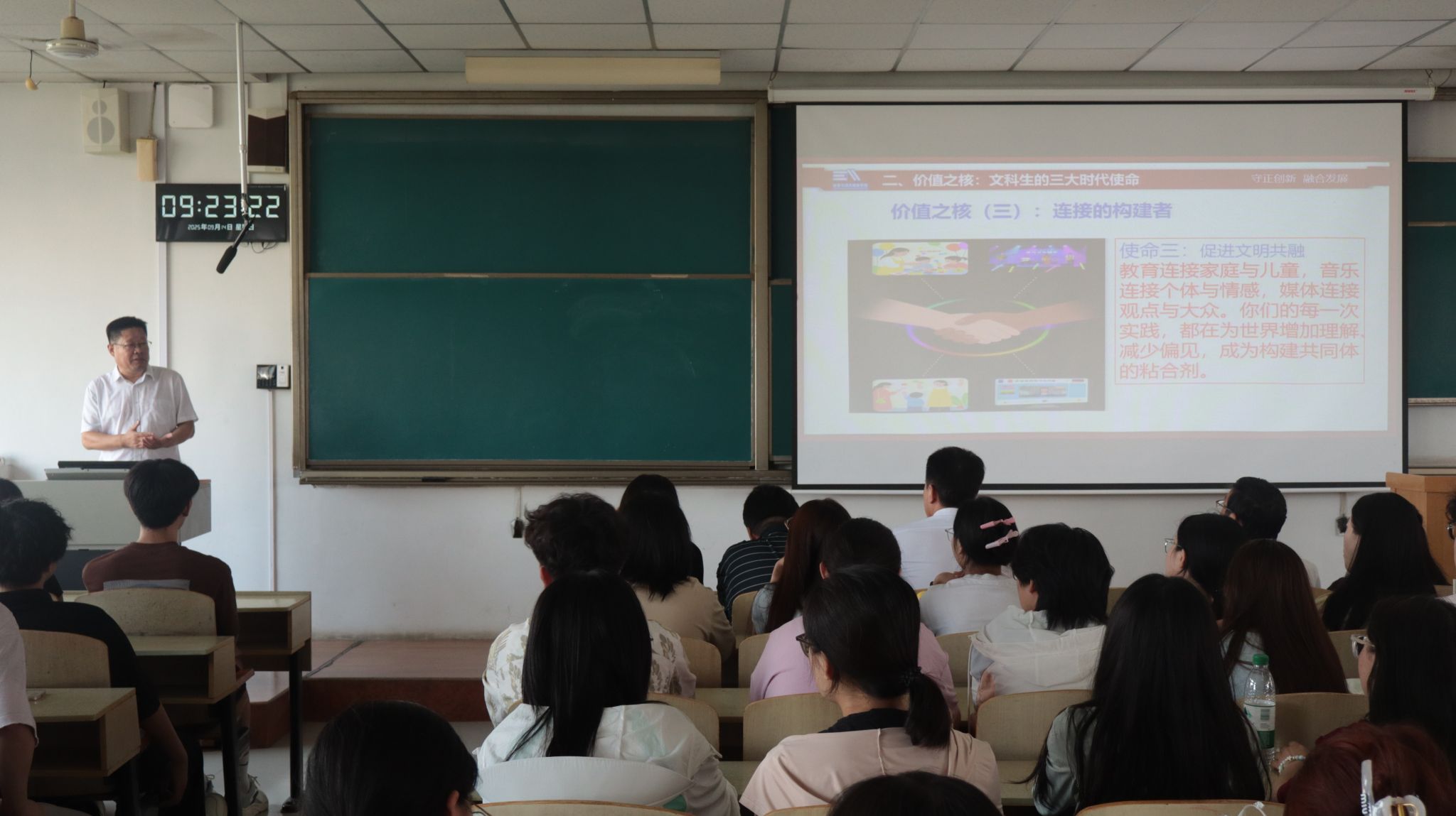 9月14日上午,学院召开2025级新生见面会,赵院长作了《在快速发展的时代,凸显文科生的价值》专题报告。赵院长从社会发展需求出发,结合人工智能时代文科专业的独特优势,阐述了学前教育、音乐学、和数字媒体艺术专业的发展前景与社会价值。会上,赵院长还为新生代表赠书,寓意知识传承与启迪。