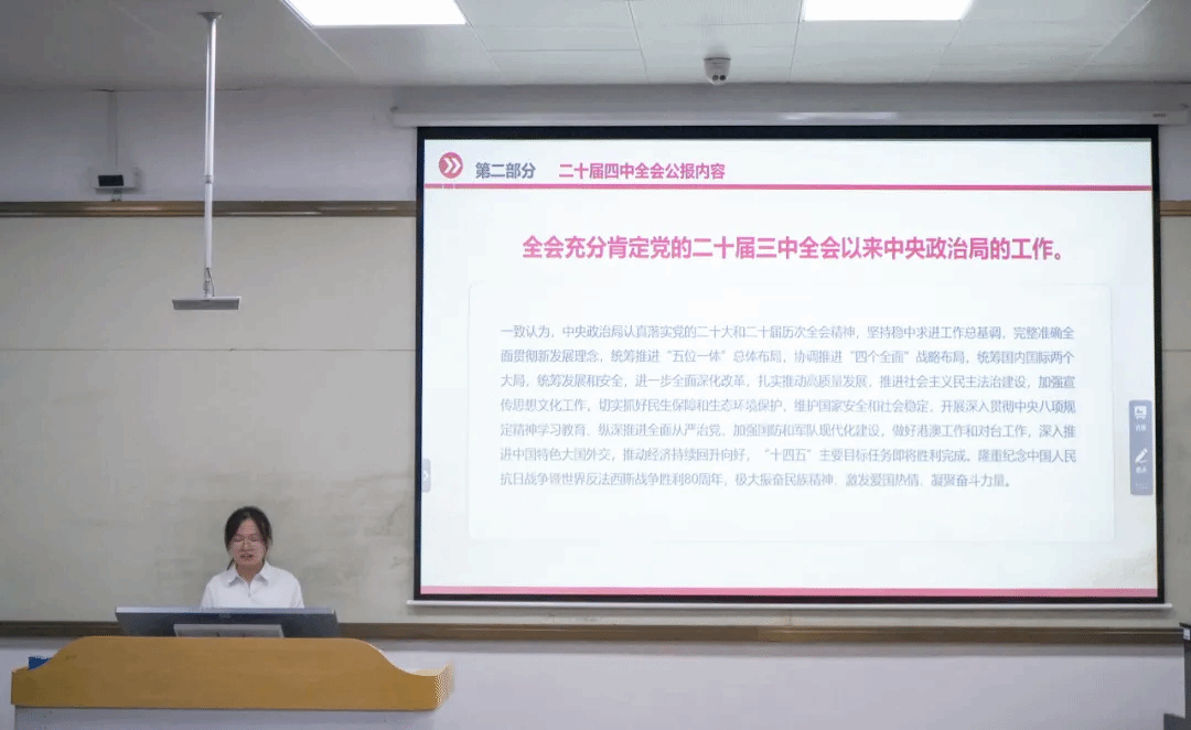 为深入学习贯彻党的二十届四中全会精神,强化青年学子的思想与责任担当,我院于12月16日在一教教室举行二十届四中全会精神专题宣讲活动。本次活动由23-25级团员共同参与,采用集中宣讲和分众宣讲形式。